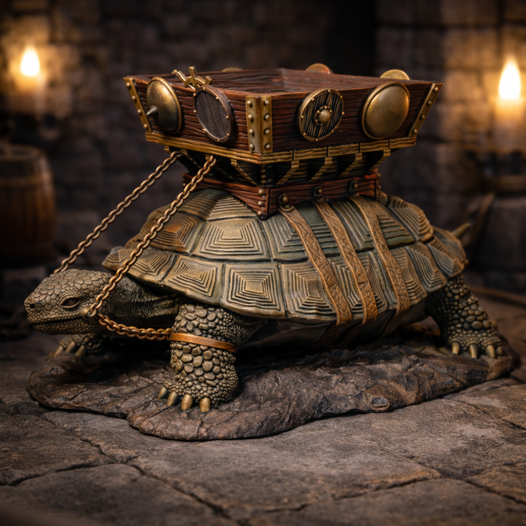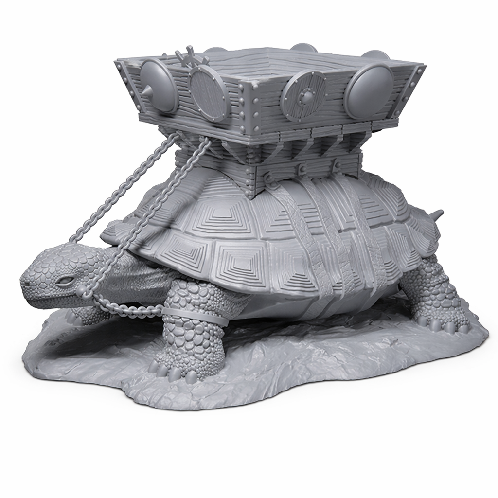 En massiv, pansret krigsskilpadde som bærer en befestet plattform på ryggen – komplett med skjoldpaneler og solide kjettinger. Dette er ikke bare et dyr, men et mobilt festningsverk på slagmarken.